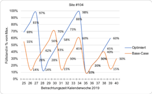 Grafik: Entleerungen und Füllstands-Entwicklung des Standorts #104 mit und ohne Optimierung.