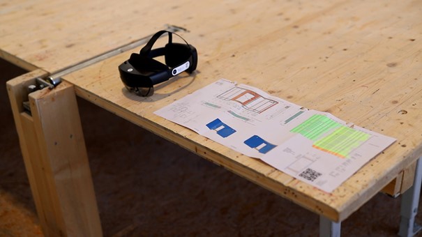 – Eine schwebende Stückliste zeigt die verschiedenen Holzstücke des Elements an. Diese Liste ist im Raum fixiert oder kann bei Bedarf mit einer Geste herbeigerufen werden.