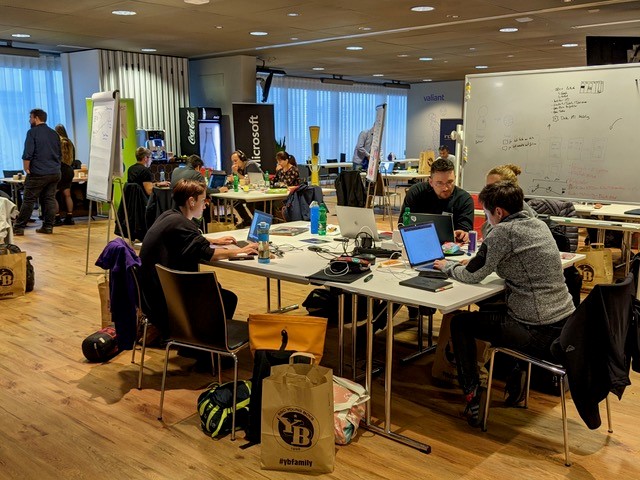Türöffnung beim YB Hackathon ist wie immer Freitag um 9 Uhr. Die Hacker:innen trudeln ein, orientieren sich mal. Schön ist zu sehen, dass es nebst den vielen neuen Teilnehmer:innen auch wieder viele bekannte Gesichter hat. Aus das letztjährige Gewinnerteam WorkFoodBalance mit Monika Blaser ist wieder mit dabei und hat sich nichts geringeres als die Titelverteidigung vorgenommen.